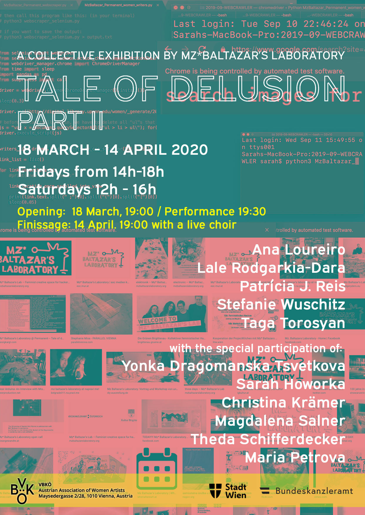 Our feminist art collective MZ* BALTAZAR’S LAB is happy to present our installation and performance ‘Tale of Delusion‘at the the network of women* artists of Austria Through a bot this project builds up a data base of female identified and non-binary artists that will get expanded through visitor’s input during the exhibition phase.