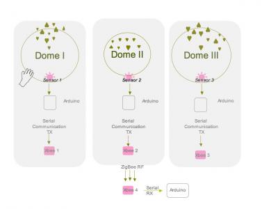 The idea was to detect bio feedback of plants, send this data from the garden (over a radio frequency connection) into okno and transform it into music.